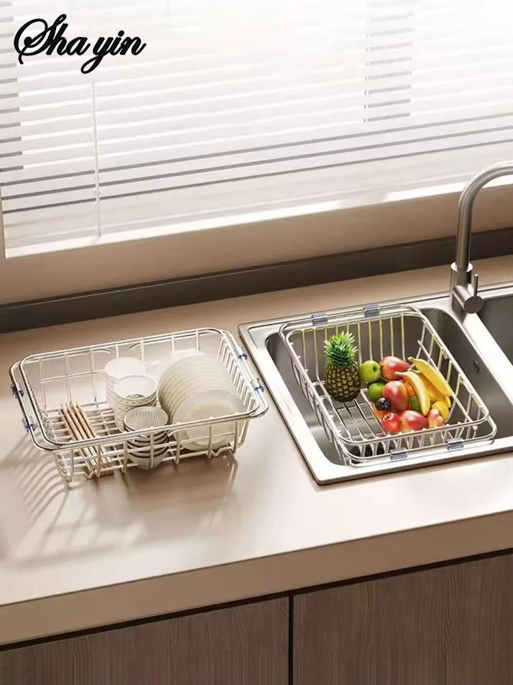 Household Stainless Steel Sink Drain Rack, Telescopic, Non-Slip, Dish Drying Rack, Kitchen, Bathroom, Countertop Organizer Rack